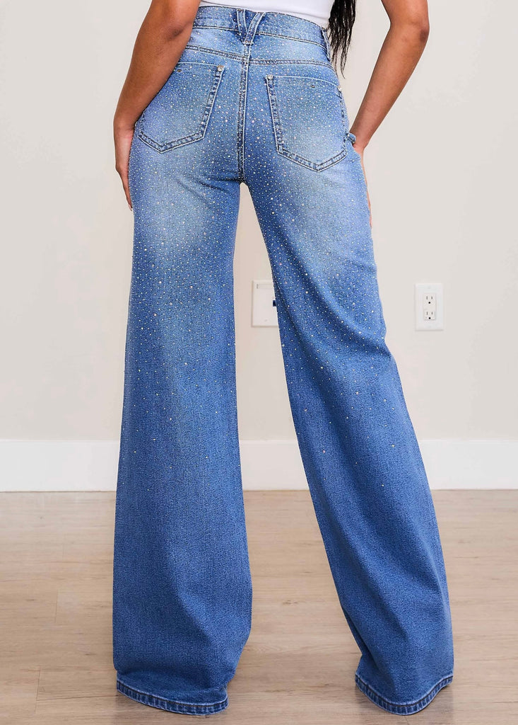 A pair of high-rise wide leg jeans featuring all over iridescent rhinestone, a classic 5-pocket construction and a zip-fly closure.